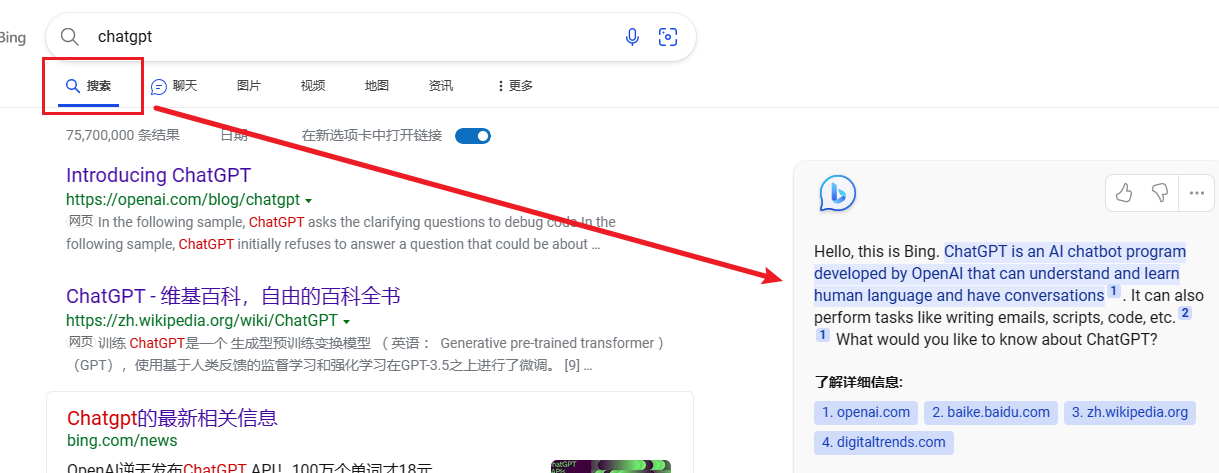 有两种使用方式,一种是正常搜索,右侧会展示new bing的结果 另一种是chat模式,点击chat会进入chat模式
