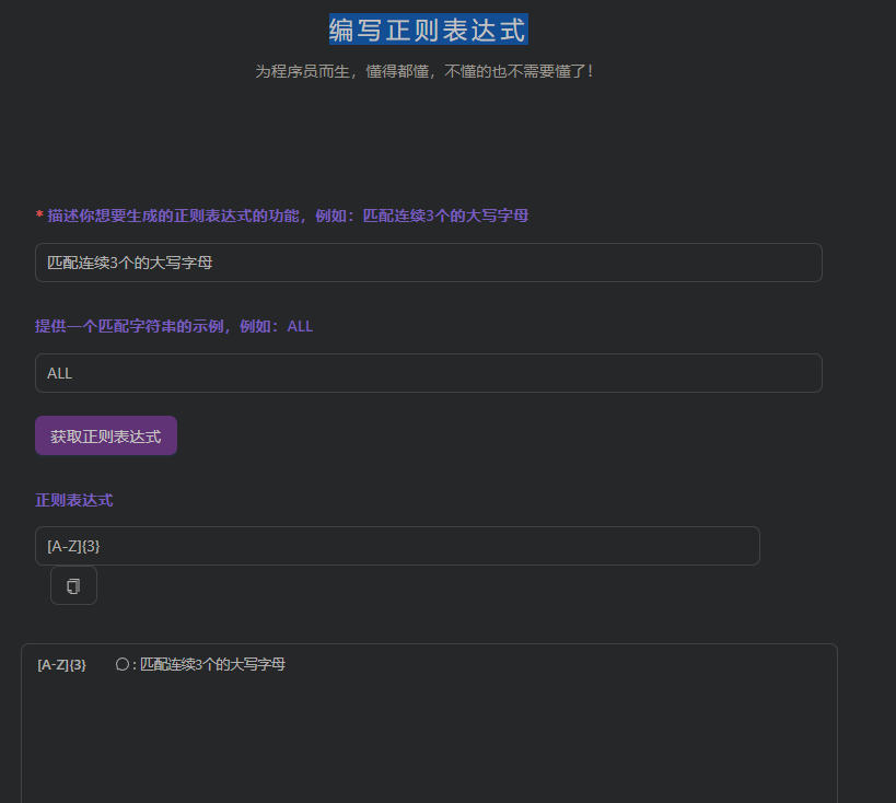 有需要的朋友,可以直接使用openai的api接口,快速自己写一个,这里有一个网上已经开发好的gpt 正则工具