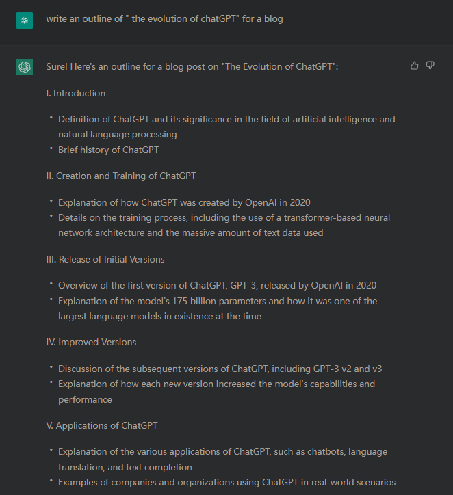 1.2 写个长篇或者论文之类,可以这样问 write an outline of " the evolution of chatGPT" for a blog