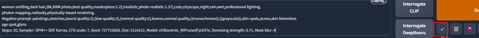 woman smilling,dark hair,(8k,RAW photo,best quality,masterpiece:1.2),(realistic,photo-realistic:1.37),cute,cityscape,night,rain,wet,professional lighting. photon mapping.radiosity.physically-based rendering. Negative prompt: paintings,sketches,(worst quality:2),(low quality:2),(normal quality:2),lowres,normal quality,((monochrome)),((grayscale)),skin spots,acnes,skin blemishes age spot,glans Steps: 20, Sampler: DPM++ SDE Karras, CFG scale: 7, Seed: 727715831, Size: 512x512, Model: chilloutmix_NiPrunedFp32Fix, Denoising strength: 0.71, Mask blur: 4