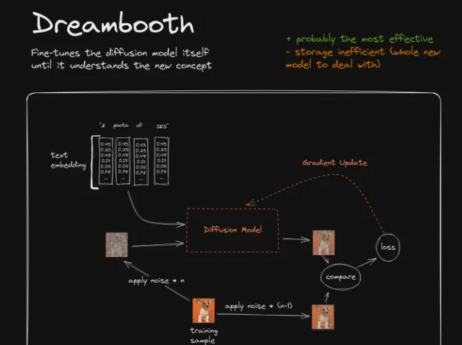 Dreambooth通过直接修改整个原始模型来对模型输出结果进行调校,微调整个网络参数