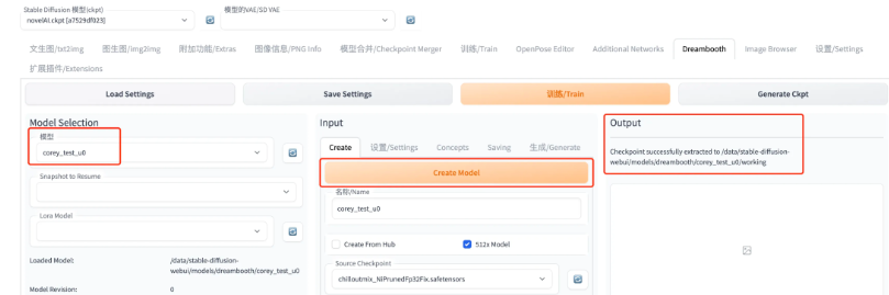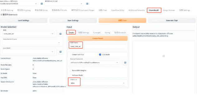 Source Checkpoint 初始化模型(ckpt文件模型);Scheduler 采样器,就是选择扩散模型的形式; 都设置好之后,点击黄色的 Create Model,稍等在 Output 处可以看到 successfully 的日志,以及在左边 Model Selection 处可以看到自己刚 Create 出来的模型